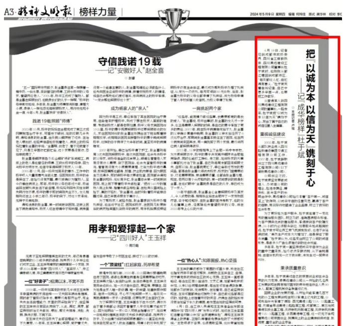 2024年05月09日,我司董事長杜于斌有幸榮獲《精神文明報》榜樣力量欄榮譽。杜于斌,作為我們...